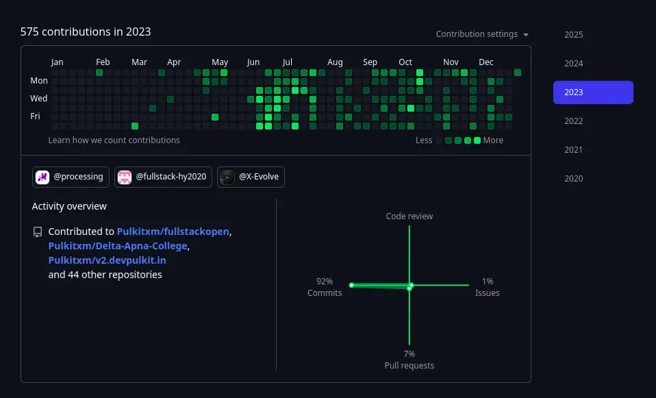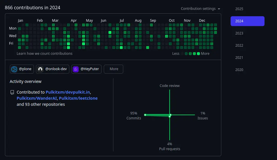 Hi, I am Pulkit from India 🇮🇳. I love building stuff, and all my projects are hosted on GitHub. I began my journey back in 8th grade. We had basic HTML-CSS classes where we learned fundamental HTML rules, and I was amazed by the wonders of the web. I used to make my all of my firend's projects. Back then, I didn't had my personal laptop - we shared a basic Dell laptop between me, my mother (for her work), and my sister. We didn't even had WiFi back then, so I couldn't explore much. I didn't even knew that there existed such a big tech world in tech that have so many things to explore, I wish I had this exposure at that time. I focused more on academics, and things stayed pretty much the same until I finished school because of the og IIT/JEE rut. Anyways by the end of school time, I had a good knowledge of vanilla HTML and Python.Then I entered the horrible world of engineering, I took admission in a decent college. That's when I started exploring how to get into tech. I saw people on YouTube shouting Do DSA, so like many others, I started with that. I bought the Alpha course from Apna College and spent 2-3 months grinding through it. I didn't find much interest there, like you have to focus on boring concepts and just do this that number of leetcode questions. I was like, "Is this all there is to tech?". I started exploring other options like web, app, cyber, you name it. Since I had some experience with web development, I decided to focus on that. Looking back, it was one of the best decisions I've made.I got really interested in web development and started learning from free YouTube resources by amazing creators like @CodeWithHarry and @ApnaCollegeOfficial. Wanting more structured guidance, I purchased another course from Apna College called Delta. I spent 4-6 months(around June-March 2023) learning from there. After completing it and learning how things work, I realized some concepts like ejs were getting outdated as tech keeps evolving and no one was talking about those concepts. So I kept exploring and building lots of projects to maintain a good grasp on concepts. If you see my contributions graph, you will see a lot of contributions in the second half of 2023.It was around somewhere same in April 2023 when One of my mentors introduced me to fullstackopen.com - a turning point in my journey. This blog-based tutorial taught me great concepts from web to DevOps to testing and app development. I completed this course as well, but it was tough for me to complete this course as this was not some video tutorial but a reading based flow and it sucked at reading at that time. Big shoutout to one of the course creators, Matti Luukkainen. You can find all my assignment solutions, certificates, and university credits at github.com/Pulkitxm/fullstackopenI discovered more awesome creators on YouTube like @Kevin Powell and @developedbyed, improving my frontend skills while creating more projects. I started following @harkirat1, @piyushgargdev, @HiteshCodeLab and @KunalKushwaha. I got most of my tech updates from them, I watched a lot project tutorials and ofcouse been through the tutorial hell. But somemhow managed to escape and continue working on my own skillsLooking back, I'd say consistency (never taking a break since day one in college) and building projects have been key to my progress. I kept my LinkedIn updated throughout my journey and now ofcourse my X account. I also did a 6 months long remote internship which I got just because of keeping my network updated with my work. I did some really cool work there. After that I took some break for my 5th semester improved my portfolio and github, If you'd see my github contributions of 2024 that were quite improved as compared to 2023.During my 5th Semester break, I approached Harkirat in one of his cohort classes regarding a referral with this notion doc and he loved my projects and profile so much that he followed me instantly during the class. He also praised me in another class. Here are the recordings of both instances: