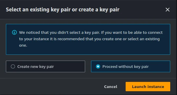 And finally launch the instance, I am going to access this instance from AWS connect, If you want to ssh into the instance you can create a key-pair and do that